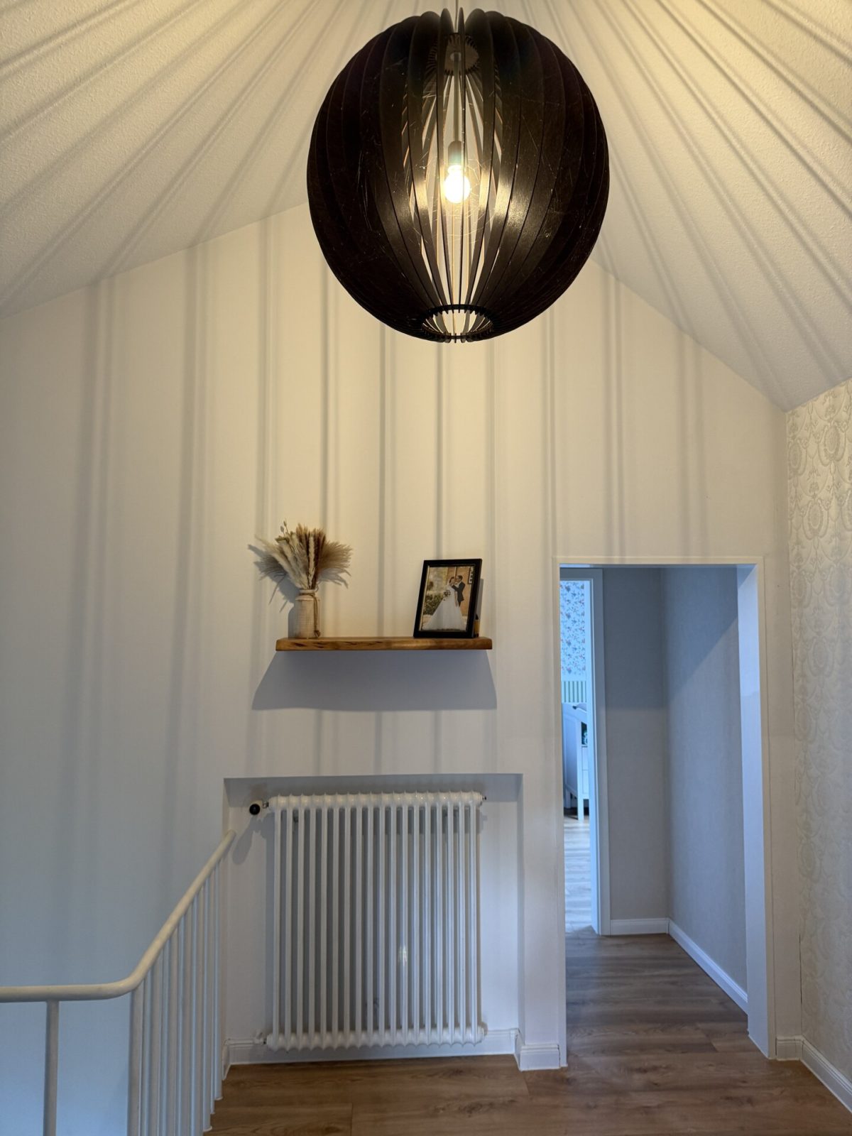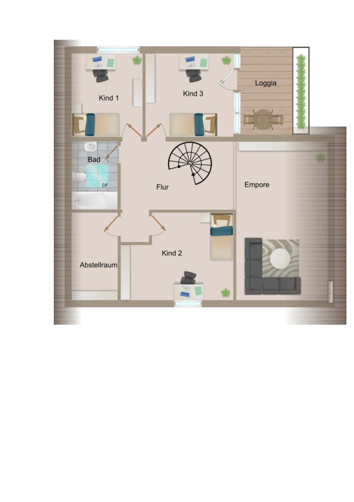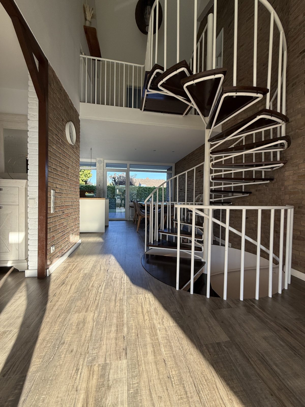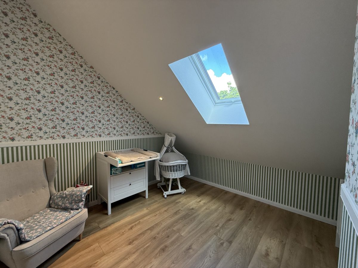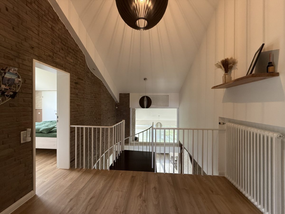 Über eine offene Wendeltreppe erreichen Sie den großzügigen Flurbereich im Obergeschoss. Hier befinden sich das Badezimmer mit Gaube und Badewanne, das Elternschlafzimmer mit Zugang zum Büro sowie drei weitere Schlafzimmer.