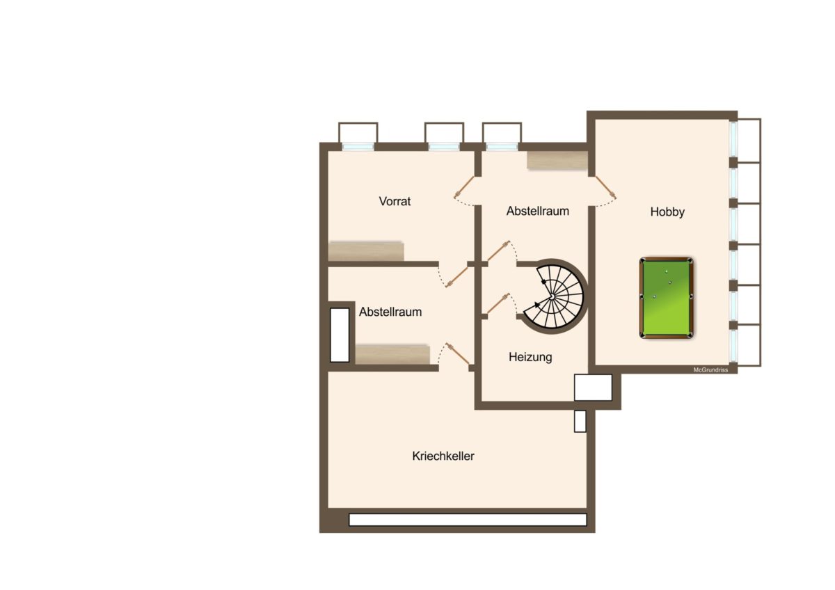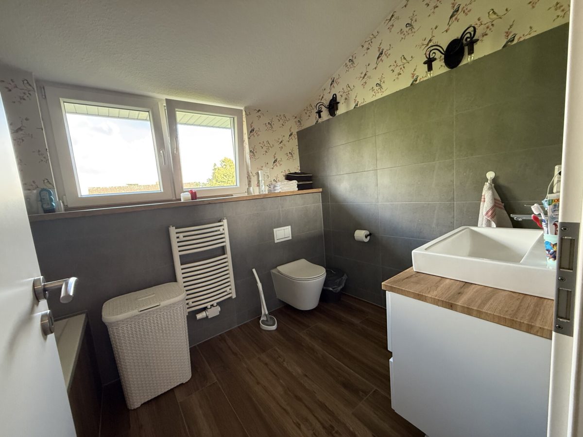 Der Vollkeller bietet einen großen, durch Lichtschächte erhellten und beheizten Raum, einen Lager- und Hauswirtschaftsbereich sowie den Heizungsraum mit moderner Gasbrennwert-Hybridheizung (2024). Etwa ein Viertel ist als Kriechkeller ausgeführt – ideal für zusätzliche Lagerfläche oder Installationen.